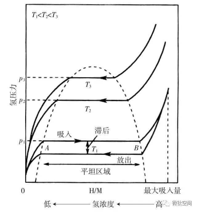 B點以后:隨著氫壓的升高,氫溶入氫化物形成固溶體的成分慢慢靠近化學計量成分。