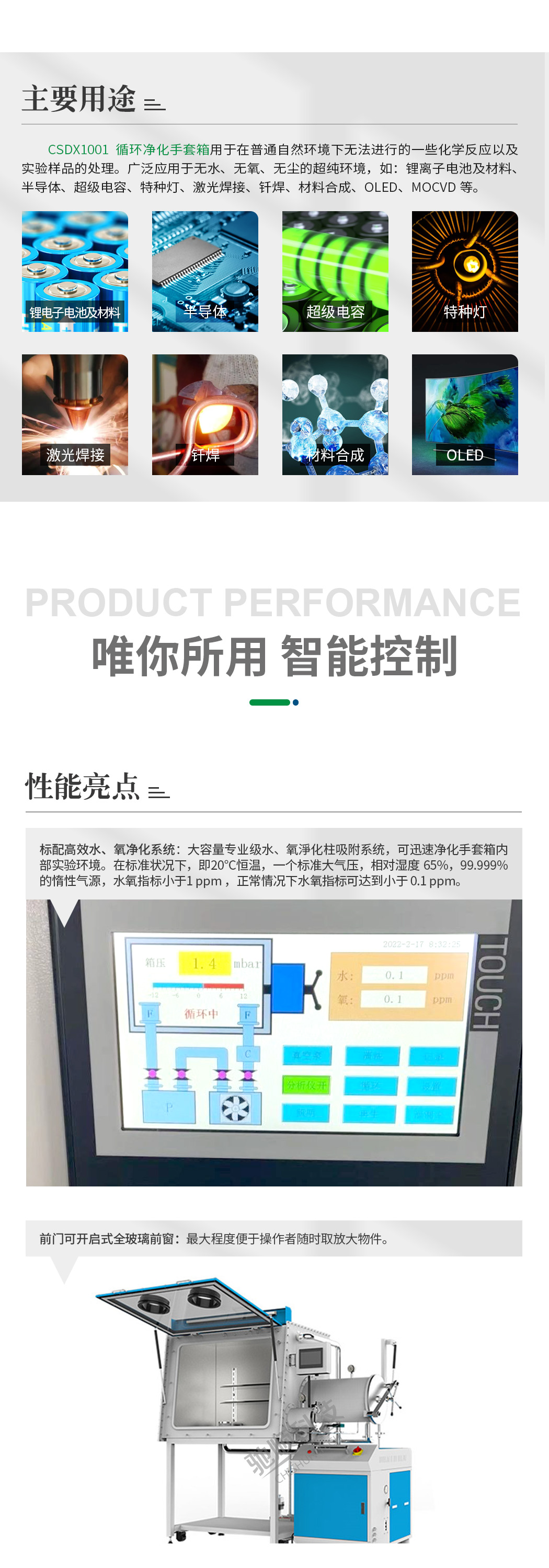 在化學(xué)反應(yīng)以及實(shí)驗(yàn)樣品的處理中,有些物質(zhì)對(duì)水和氧都十分敏感,在普通自然環(huán)境下無(wú)法進(jìn)行。使用循環(huán)凈化手套箱可使這類物質(zhì)在相對(duì)無(wú)氧、無(wú)水的惰性氣體環(huán)境下反應(yīng)和測(cè)試。 產(chǎn)品廣泛應(yīng)用于鋰離子電池及材料、半導(dǎo)體、薄膜制備、納米材料、催化劑、超級(jí)電容、特種燈、激光焊接、釬焊、鈦合金焊接等。