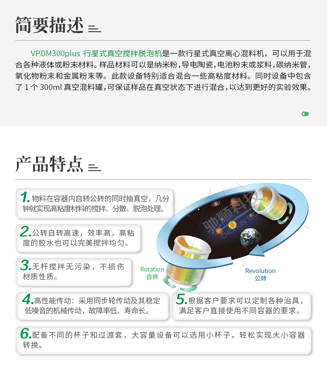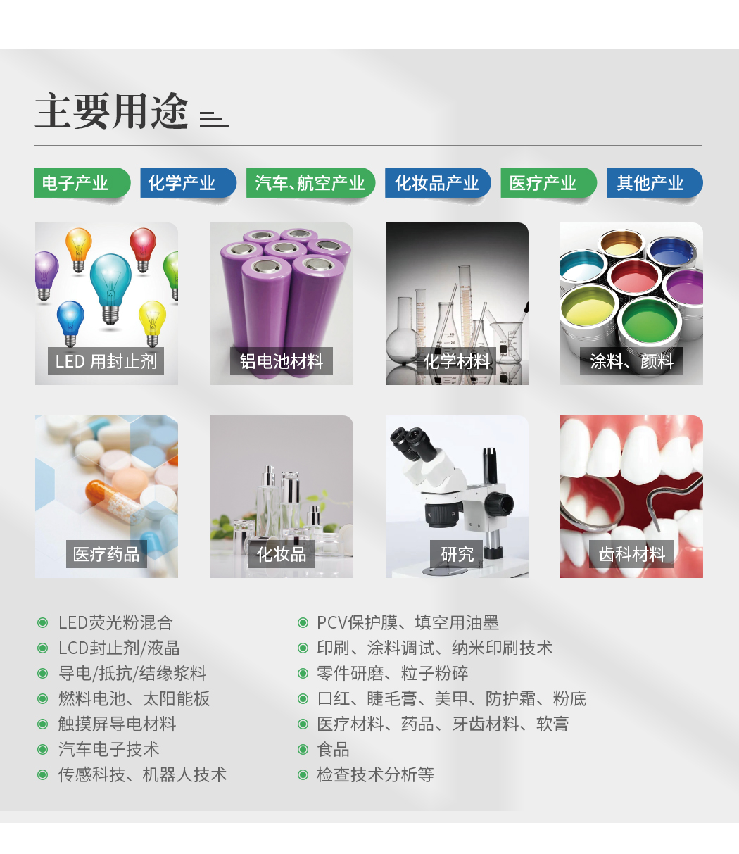 VPDM300plus行星式真空攪拌脫泡機(jī)是一款行星式離心混料機(jī),可以用于混合各種液體或粉末材料。樣品材料可以是納米粉,導(dǎo)電陶瓷,電池粉末或漿料,碳納米管,氧化物粉末和金屬粉末等。此款設(shè)備特別適合混合一些高粘度材料。行星式真空攪拌脫泡機(jī)廣泛應(yīng)用于LED、LCD、醫(yī)療器械、電子元器件、納米粉體材料、精細(xì)化工材料、印刷電子材料、電子封裝材料及新能源材料等高、尖、精領(lǐng)域產(chǎn)品的材料的混合攪拌領(lǐng)域,如熒光粉、硅膠、銀漿、鋁漿、粘合劑、油墨、銀納米顆粒、銀納米線、LED/OLED/SMD/COB導(dǎo)電銀膠、絕緣膠,RFID印刷導(dǎo)電油墨及各向異性導(dǎo)電膠ACP、薄膜太陽(yáng)能電池用導(dǎo)電漿料、PCB/FPC用導(dǎo)電油墨等等,從液態(tài)到固態(tài)、液態(tài)與液態(tài)、固態(tài)與固態(tài)物質(zhì)的攪拌均可。