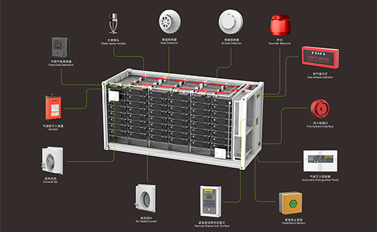 為確保儲能柜在緊急情況下的安全,本項目特別設計了包含火災探測報警系統(tǒng)和全氟己酮滅火系統(tǒng)的綜合消防方案。